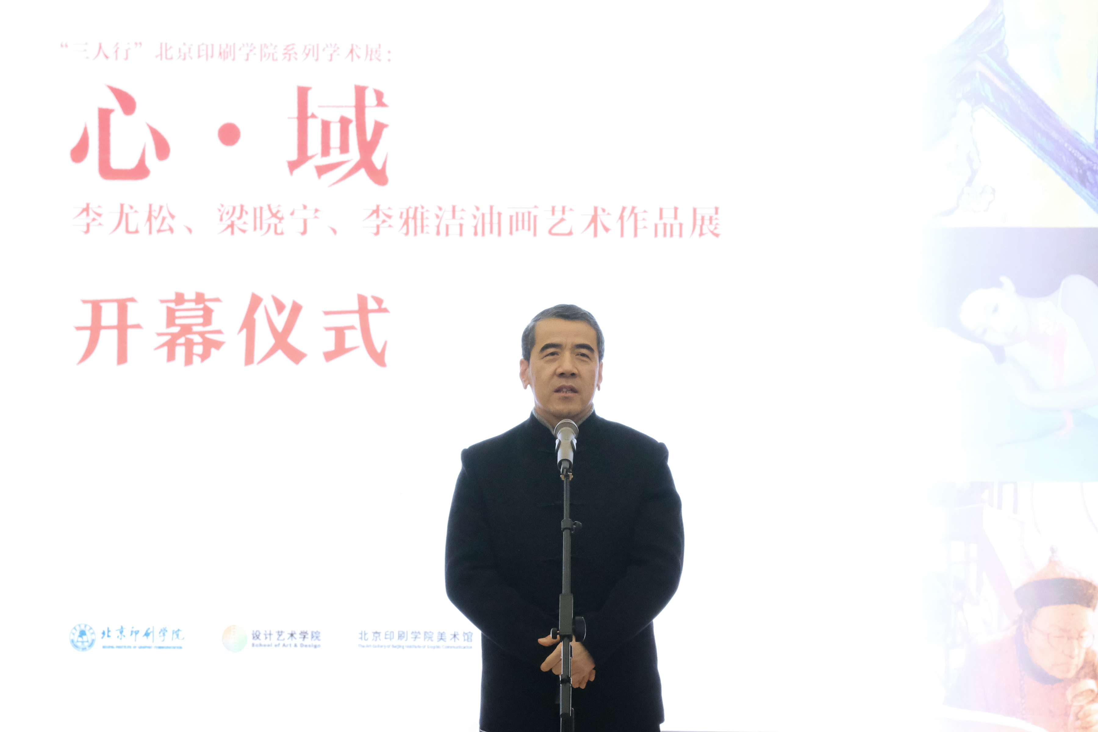 12月11日“三人行”北京印刷学院系列学术展:心·域—李尤松、梁晓宁、李雅洁油画艺术作品展在北京印刷学院美术馆开幕。中国美术家协会插图装帧艺委会主任、北京美术家协会副主席、北京对外友协副会长、北京印刷学院党委副书记、院长田忠利,国家民族画院院长、中国油画学会理事、北京美术家协会理事、中央民族大学美术学院副院长李贵男,中国舞台美术学会副会长、中国动画学会理事、中国戏曲学院新媒体艺术系原主任于少非,黑龙江奥云投资有限责任公司总经理尹鹏飞,绘本画家、田宇绘本工作室创始人田宇,《青年视觉vision》杂志视觉实验室栏目艺术编辑马宁,学校外事处、教务处负责人,设计艺术学院、新媒体学院众多师生参加了开幕式。开幕式由学校美术馆馆长、美术与书法学科负责人、设计艺术学院党委书记史民峰主持。